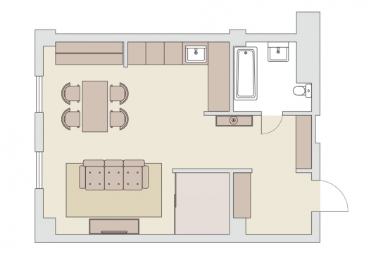 Квартиры-студии идеально подойдут для проживания 1-2 человек. В квартиры входит кухня, спальня, гостинная, прихожая и санузел.